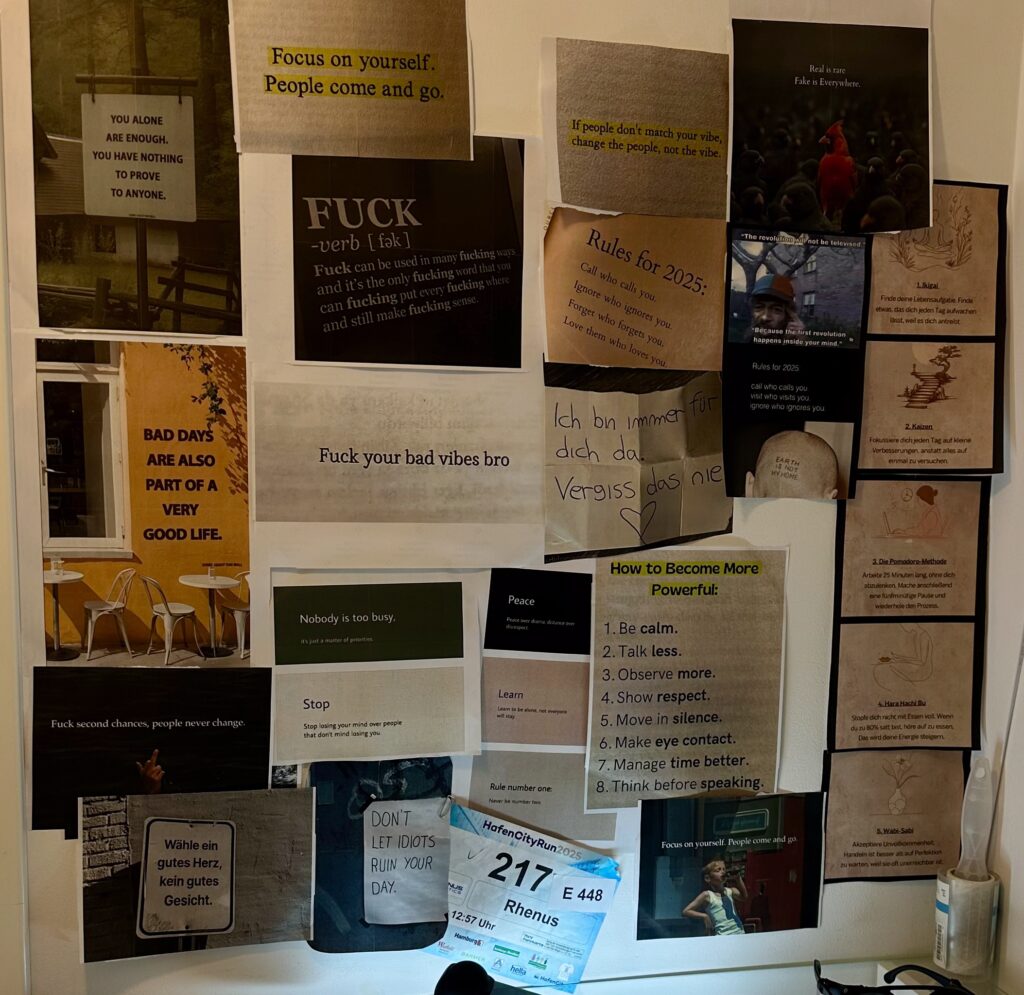 Tai mano asmeninė motyvacijos siena — vizualinis žemėlapis, kuriame susipina mintys, idėjos, tikslai ir emocijos. Ji atspindi mano vidinį pasaulį, primena, kur einu, kodėl einu ir kas mane skatina nepasiduoti.